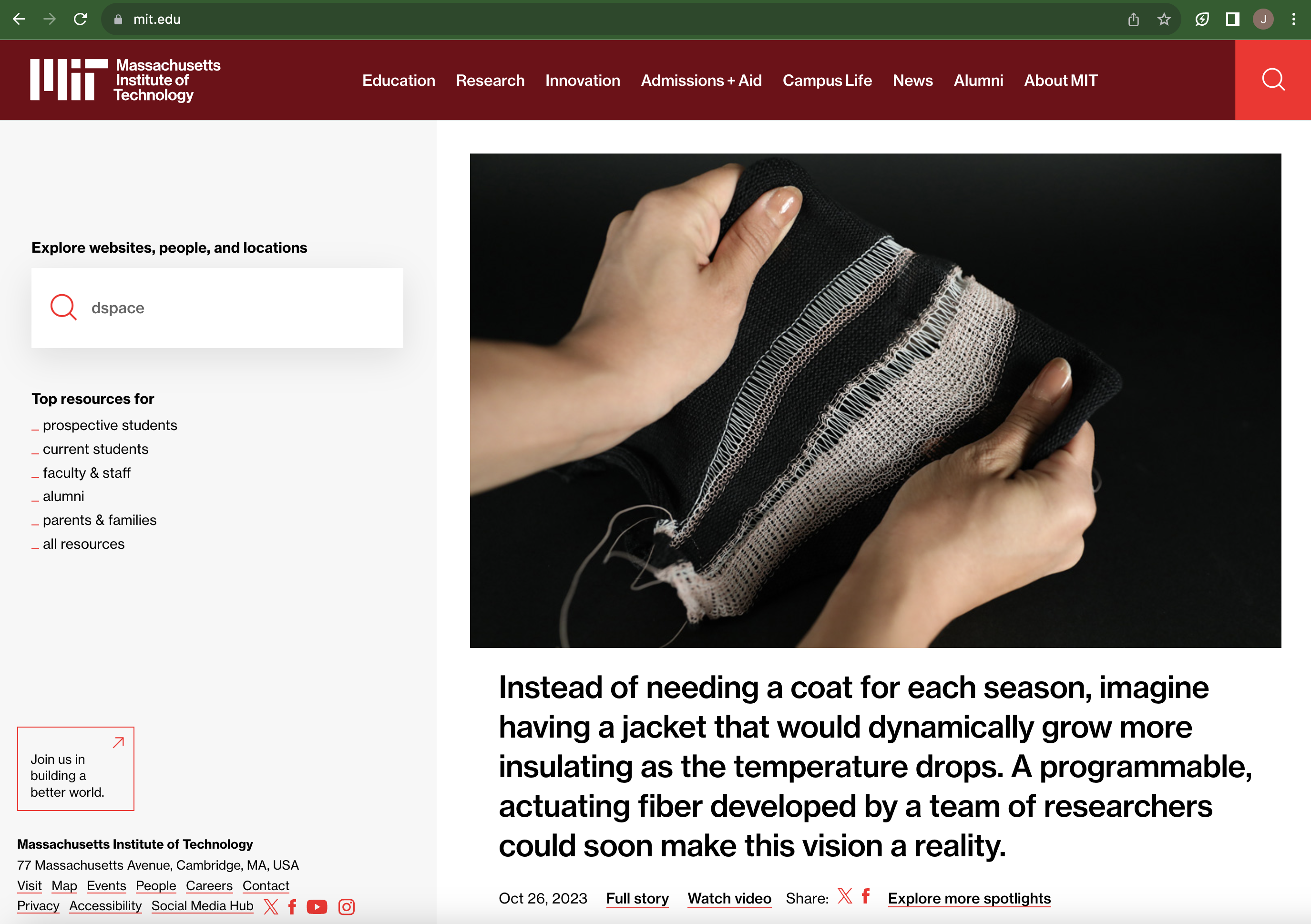 FibeRobo, a research project led by Media Lab PhD student Jack Forman, won gold in the Textile & Materials / New Technology Fabrics category at the 2023 International Design Awards. The project design team includes Ozgun Kilic Afsar, Sarah Nicita, Rosalie Hsin-Ju Lin, Liu Yang, Akshay Kothakonda, and Professor Hiroshi Ishii from the Tangible Media research group; other collaborators include Cedric Honnet (Responsive Environments group), Neil Gershenfeld (MIT Center for Bits and Atoms), and Megan Hofmann (Khoury College of Computer Sciences at Northeastern University). FibeRobo is a novel body-temperature shape-changing fiber based on liquid crystal elastomers. The development of a new fabrication technique and chemical composition of the fiber enables self-reversing morphing at, or optionally slightly above, body temperature. These fibers, once formed into the larger textile structure through knitting, weaving, and sewing techniques, enables a myriad of applications from medical devices (compressions shirts), athletic wear (self-ventilating clothing), to interactive eating experiences (morphing table cloths), and transforming fashion pieces. The International Design Awards (IDA) recognize and celebrate smart, sustainable, multidisciplinary innovation across architecture, interior, product, graphic, and fashion design worldwide. The Farmani Group founded the IDA as the design sibling of the Annual Lucie Awards for Photography, which has emerged as one of the world’s most prestigious photography awards.
