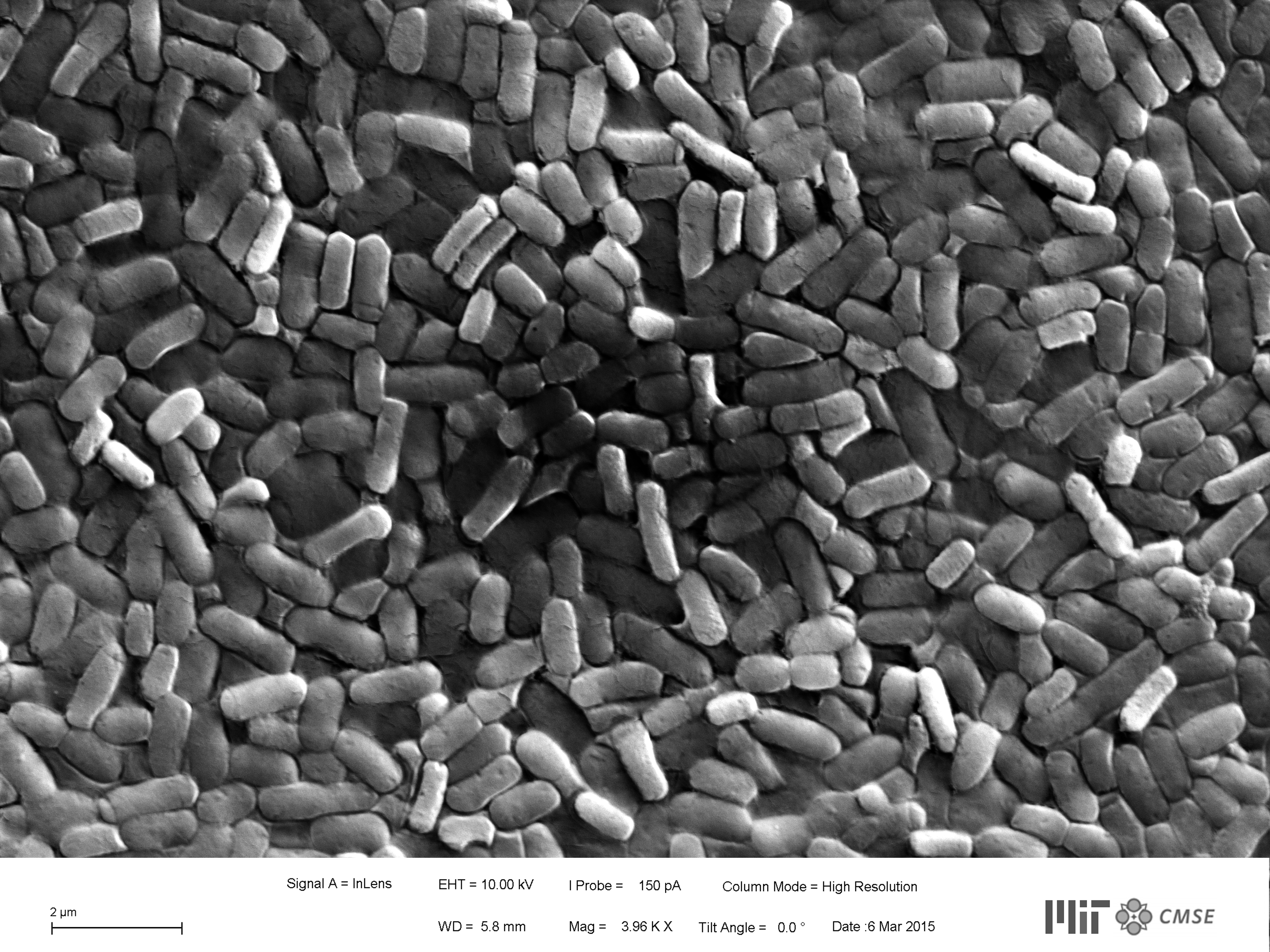 Microscopic view of the bio- hybrid film with Bacillus Subtilis Natto bacteria (Scanning Electron Microscope from MIT CMSE)