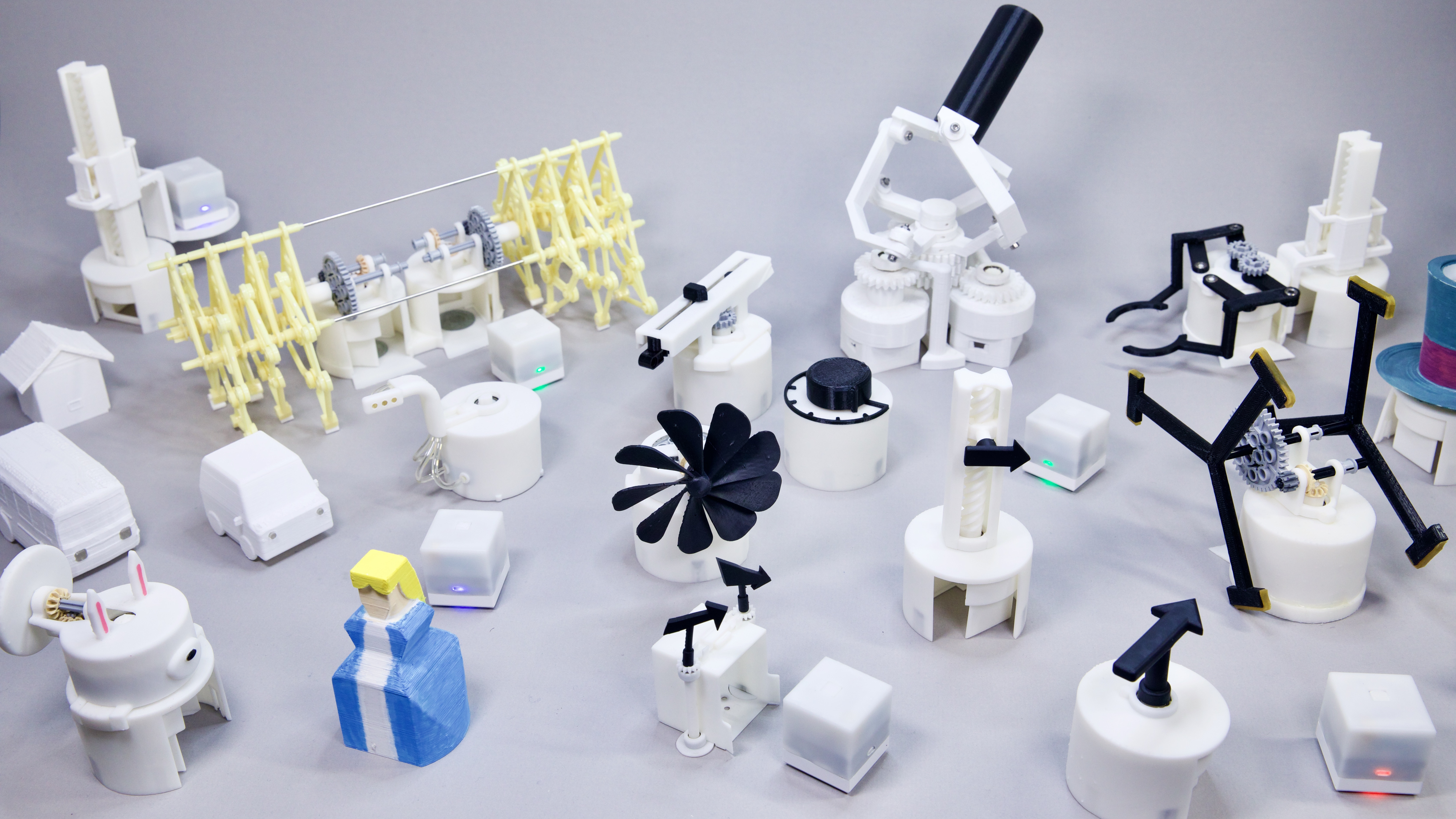 As for our proof-of-concept system, we have implemented an interactive system based on off-the-shelf robotic toy, toio, with several modifications to enable the active docking capability. We have developed custom-built control architecture to handle the I/O for multiple toio robots using a single computer. A variety of mechanical shells were designed based on four primitive designs, and fabricated with 3D printers. With this system, we introduce a rich application space including physical space organization, digital data physicalization, and entertainment and storytelling systems.