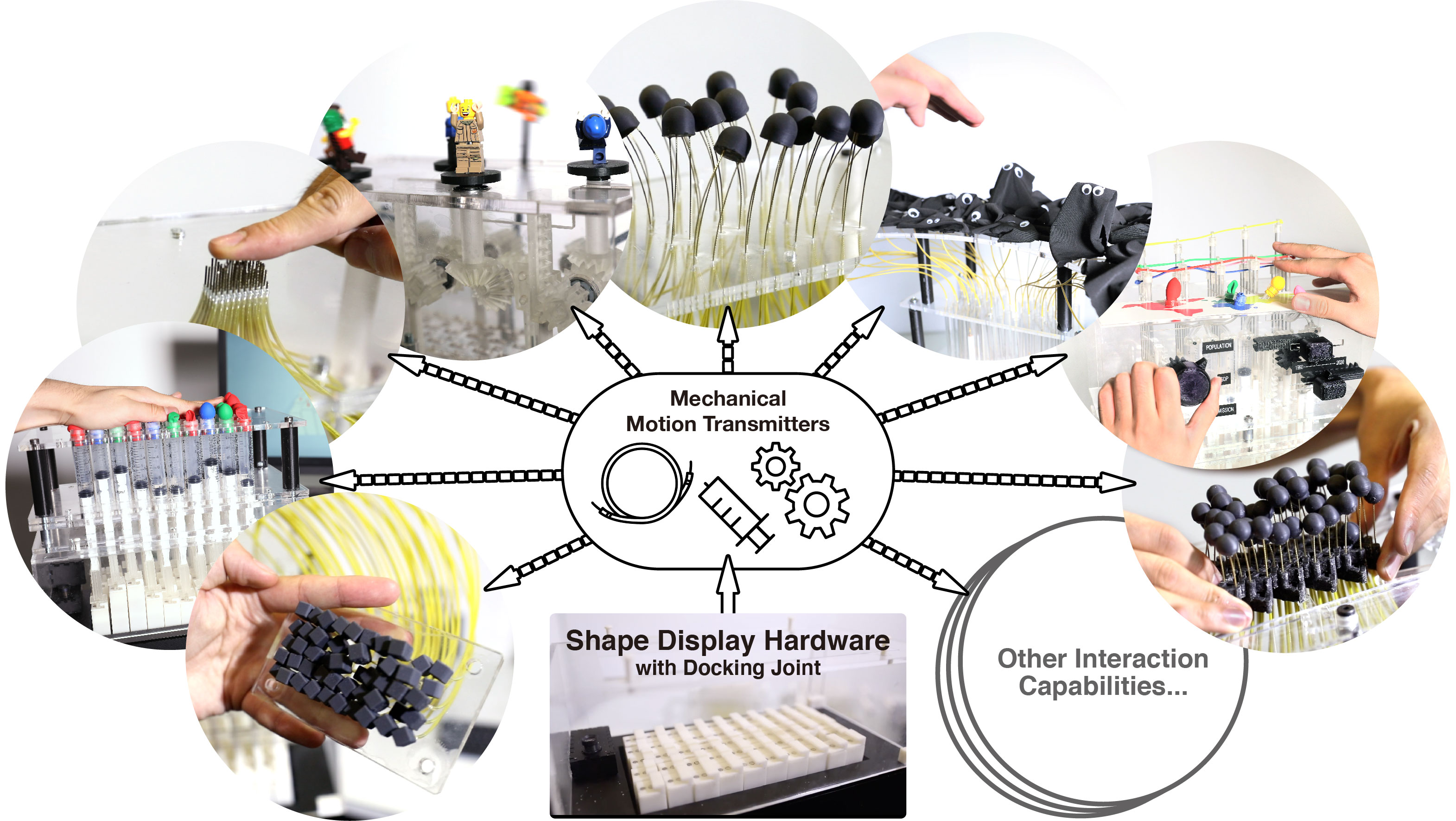 Through TRANS-DOCK, we intend to expand the expressibility, adaptability, and customizability of a single shape display for dynamic physical interaction. By converting arrays of linear motion to several types of dynamic motion in an adaptable and flexible manner, we advance shape displays to enable versatile embodied interactions for a variety of digital/physical everyday applications.